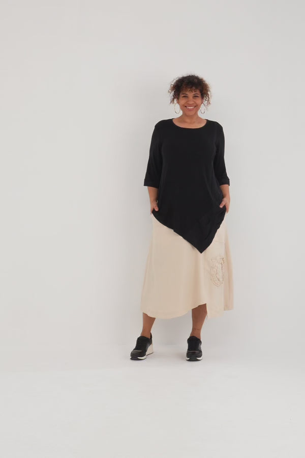 „Kira“ ist dein Go-to, wenn Komfort und Stil sich nicht ausschließen sollen. Der figurfreundliche Schnitt umspielt sanft die Silhouette, während der Rundhals & 3/4-Ärmel für eine entspannte, cleane Note sorgen. Der asymmetrische Saum setzt ein dezentes Statement und verlängert optisch – ideal zu schmalen Jeans oder weiten Hosen.