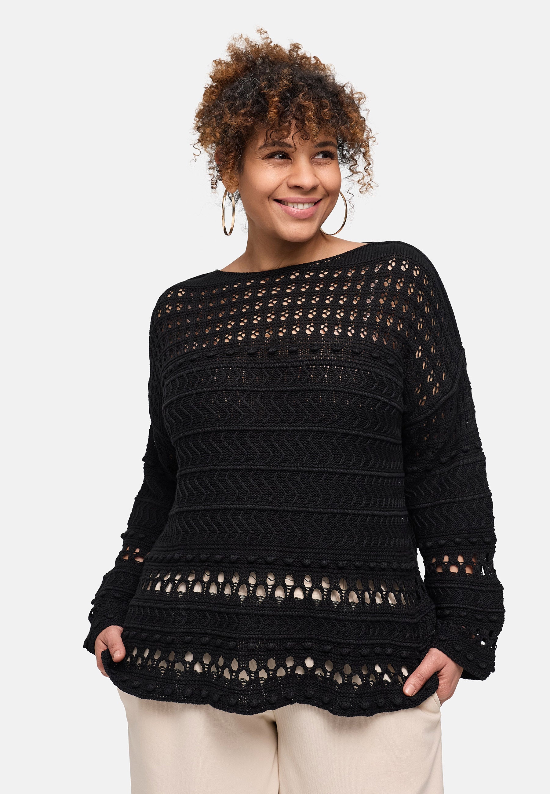 Der feine Baumwollstrick kombiniert grafische Ajourreihen mit sanften Zopfstrukturen und erzeugt einen spannenden, aber ruhigen Look. Dank des entspannten Schnitts fällt das Shirt locker über Hüfte und Bauch, ohne an Volumen zuzulegen. Schwarz wirkt clean und citytauglich, Beige natürlich und soft, Pink sorgt für ein frisches Statement. Durch die leichte Transparenz eignet es sich ideal zum Layern.